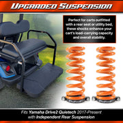 Upgrade your Yamaha Drive2 Quietech (2017 and newer) with our ProFormX Heavy Duty Rear Springs, designed specifically for models with independent rear suspension. Perfect for carts outfitted with a rear seat or utility bed, these shocks enhance your cart’s load-carrying capacity and overall stability.