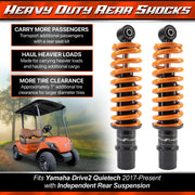 Upgrade your Yamaha Drive2 Quietech (2017 and newer) with our ProFormX Heavy Duty Replacement Rear Shocks, designed specifically for models with independent rear suspension. Perfect for carts outfitted with a rear seat or utility bed, these shocks enhance your cart’s load-carrying capacity and overall stability.
