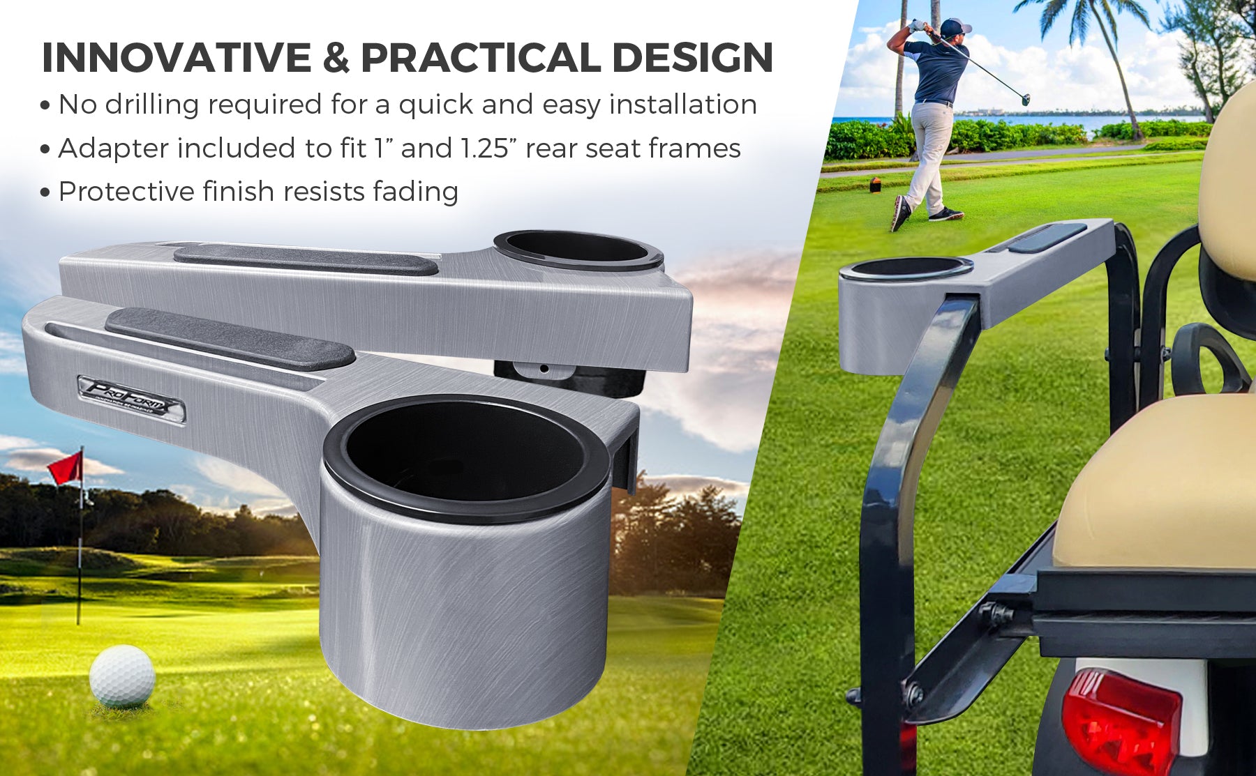 • ✅ UNIVERSAL FITMENT – Included are brackets to mount to either a 1” square frame or 1.25” square frame golf cart back seat kit. Universal fitment for a Club Car rear seat kit EZGO rear seat kit Yamaha rear seat kit STAR rear seat kit and Icon rear seat kit. The golf cart cup holder design will not interfere with the flipping of the golf cart rear seat.