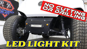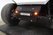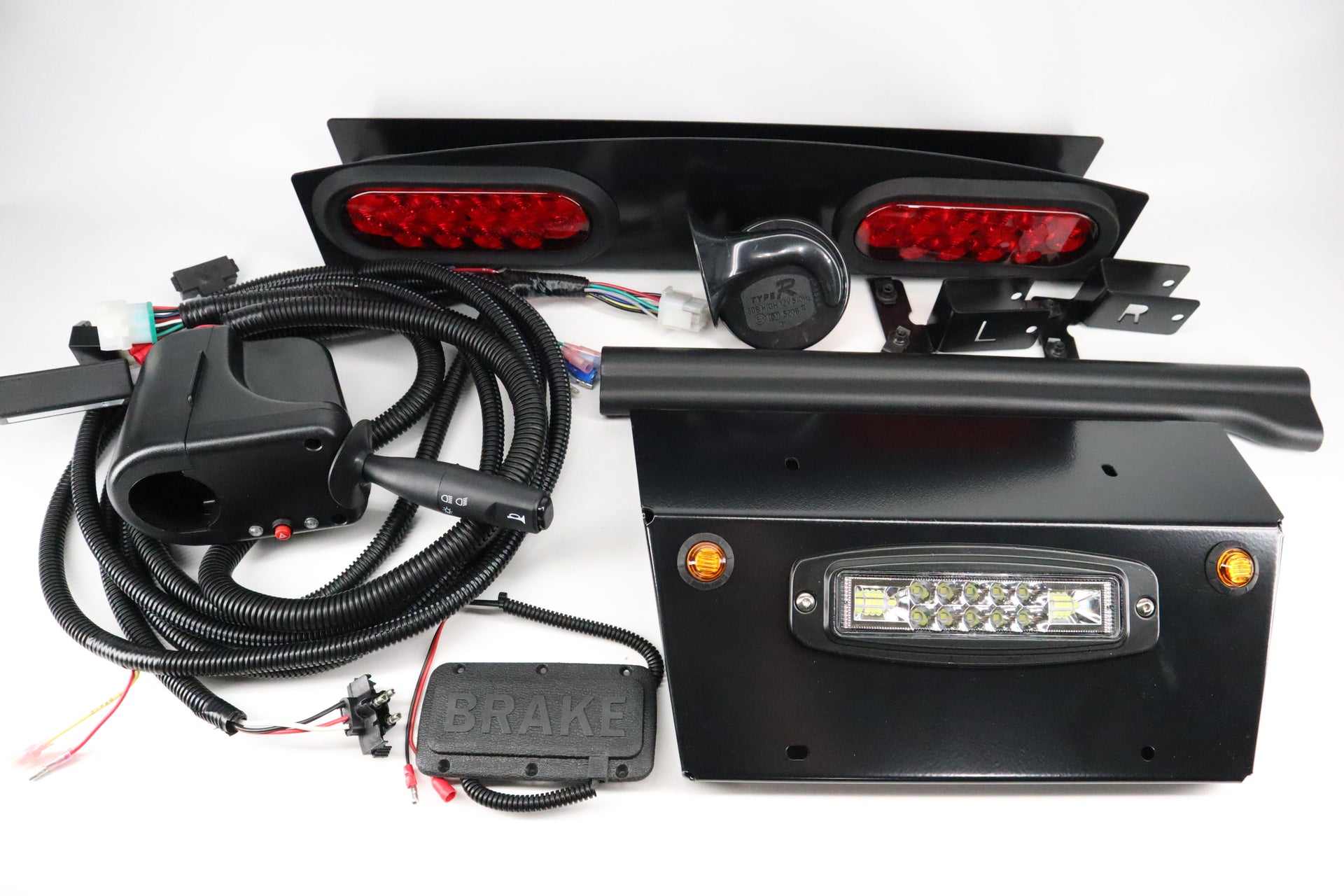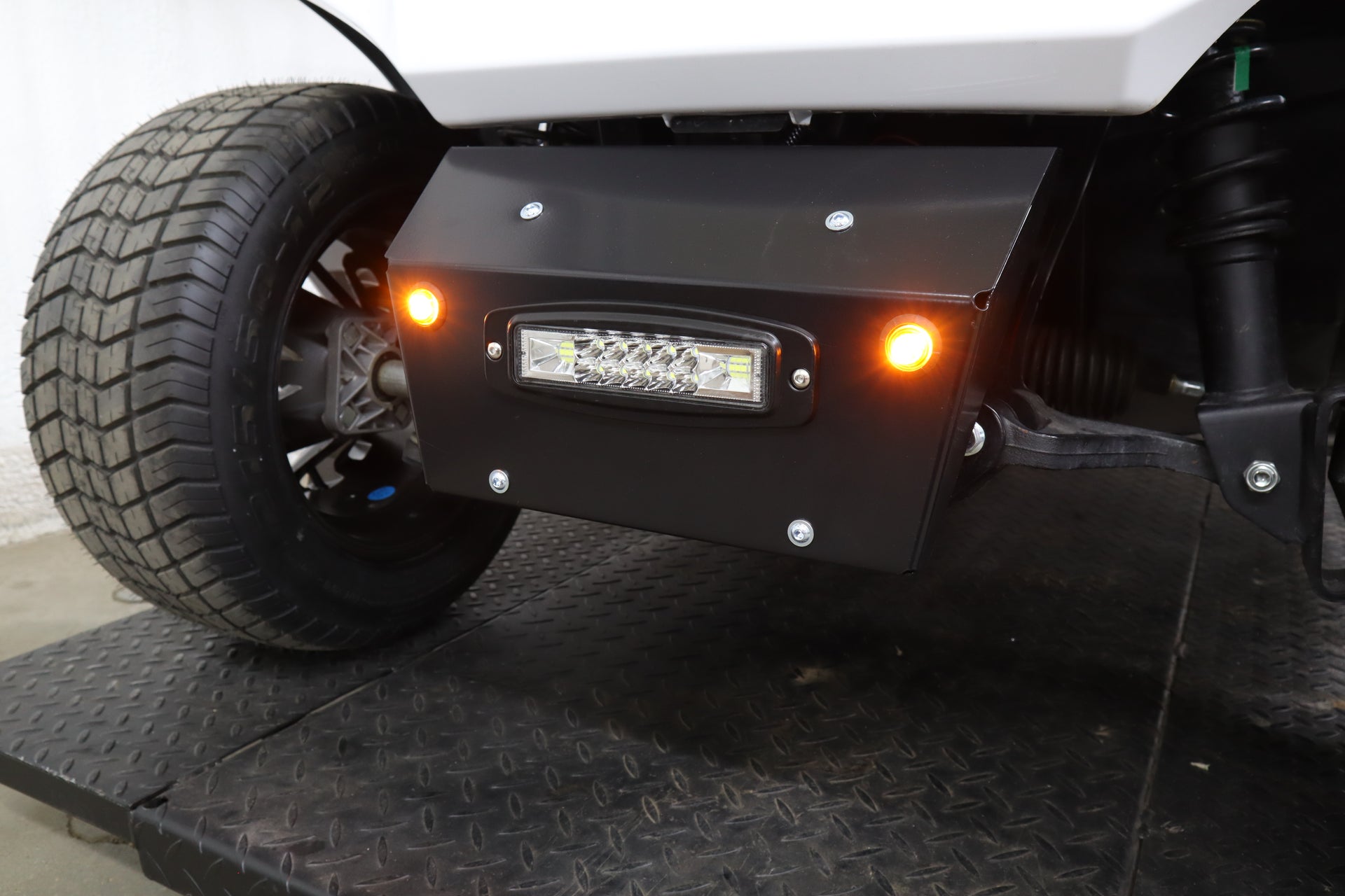 This premium light kit adds headlight, tail lights, turn signals, brake lights, and a horn to 2017+ newer Yamaha Drive 2 Fleet gas carts. This kit uses the OEM rear top supports to mount the tail lights (see pictures). If your cart has an aftermarket extended top that uses different rear top supports you will NOT be able to use this kit. No cutting or drilling of the body is required. All parts easily bolt on and plug in. The plastic front bumper is replaced with a full steel bumper, which includes mounting holes for the headlight and turn signals. The LED lights provide great visibility and require less power than other bulbs.