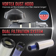 Improved Filtration: The canister air filter design significantly reduces the accumulation of dirt and debris by elevating the air filter position. The included vortex dust hood helps expel larger particles before they reach the filter, ensuring cleaner air intake.